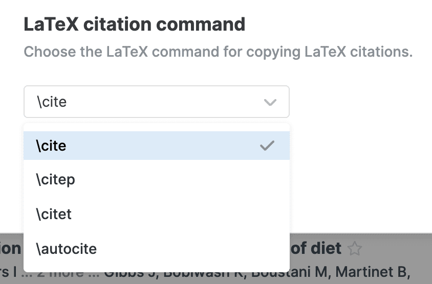 - LaTeX citation command: This setting controls which LaTeX command is used when you copy citations. Select your preferred citation command from the menu.