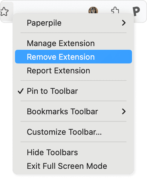 To uninstall the add-on, right-click the Paperpile button in the toolbar and select Remove Extension.
