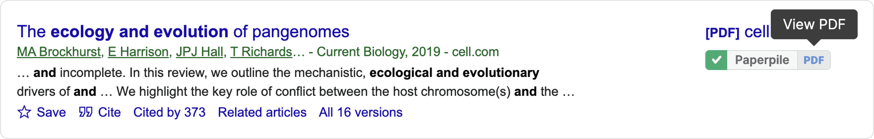 The Paperpile extension adds buttons to search results on academic websites. Click the Paperpile button to save a reference to your library, then click PDF on the button to open it.