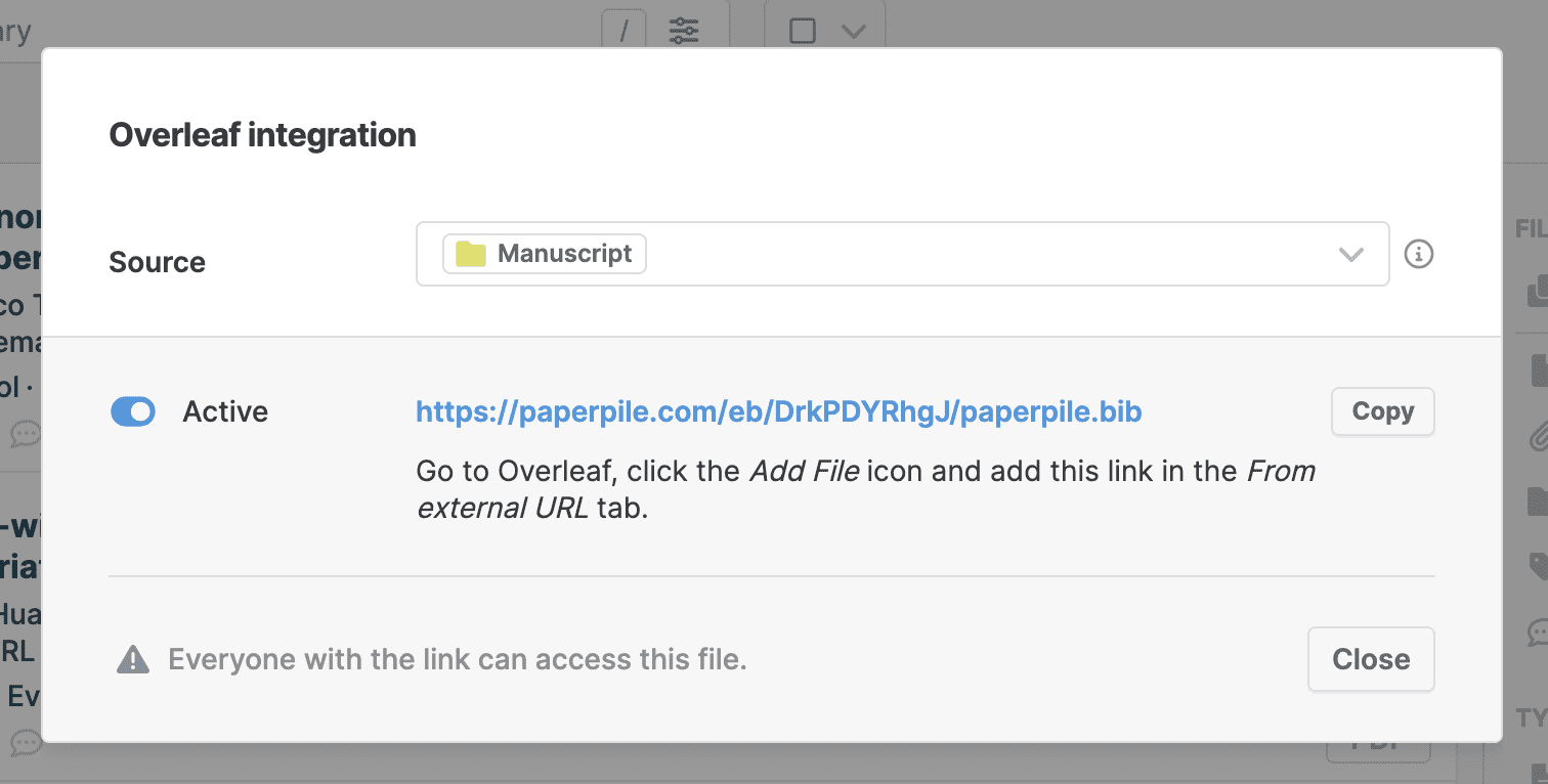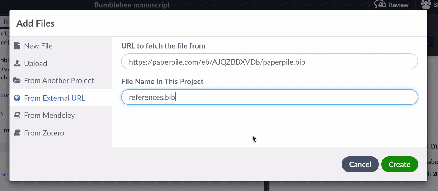 6. Include the BibTeX file in your LaTeX document, e.g. \bibliography{references} . You can add the Paperpile generated BibTeX file in addition to existing BibTeX files. Just add multiple BibTeX files in your LaTeX document as \bibliography{references, other-references}.