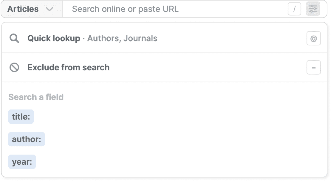 - Quick lookup: Press @in the search box to filter by author or journal using Quick lookup.