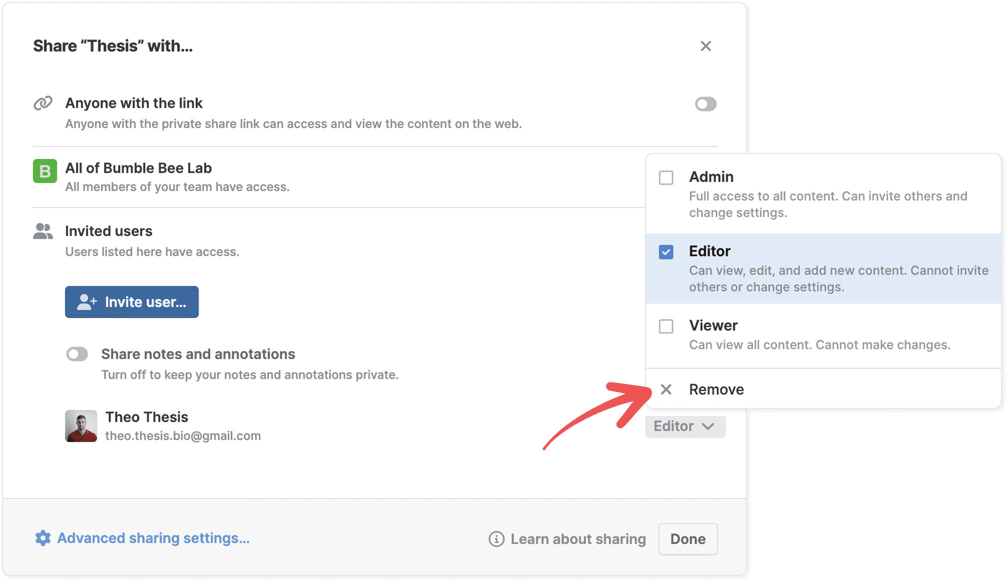 - To remove an individual user, find them in the list at the bottom and select Remove from the permissions menu. To remove all users and turn off sharing, turn off the switch Invited users.
