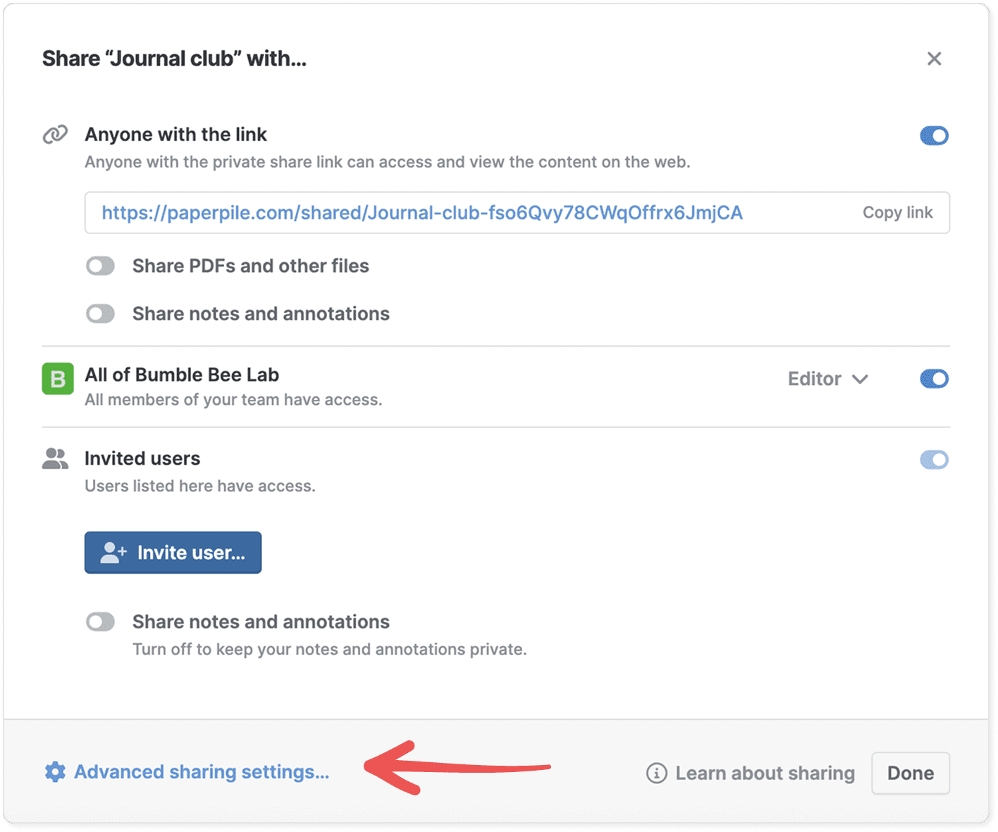 Share a folder using a private link so anyone can view the references, PDFs, and annotations—even without a Paperpile account.