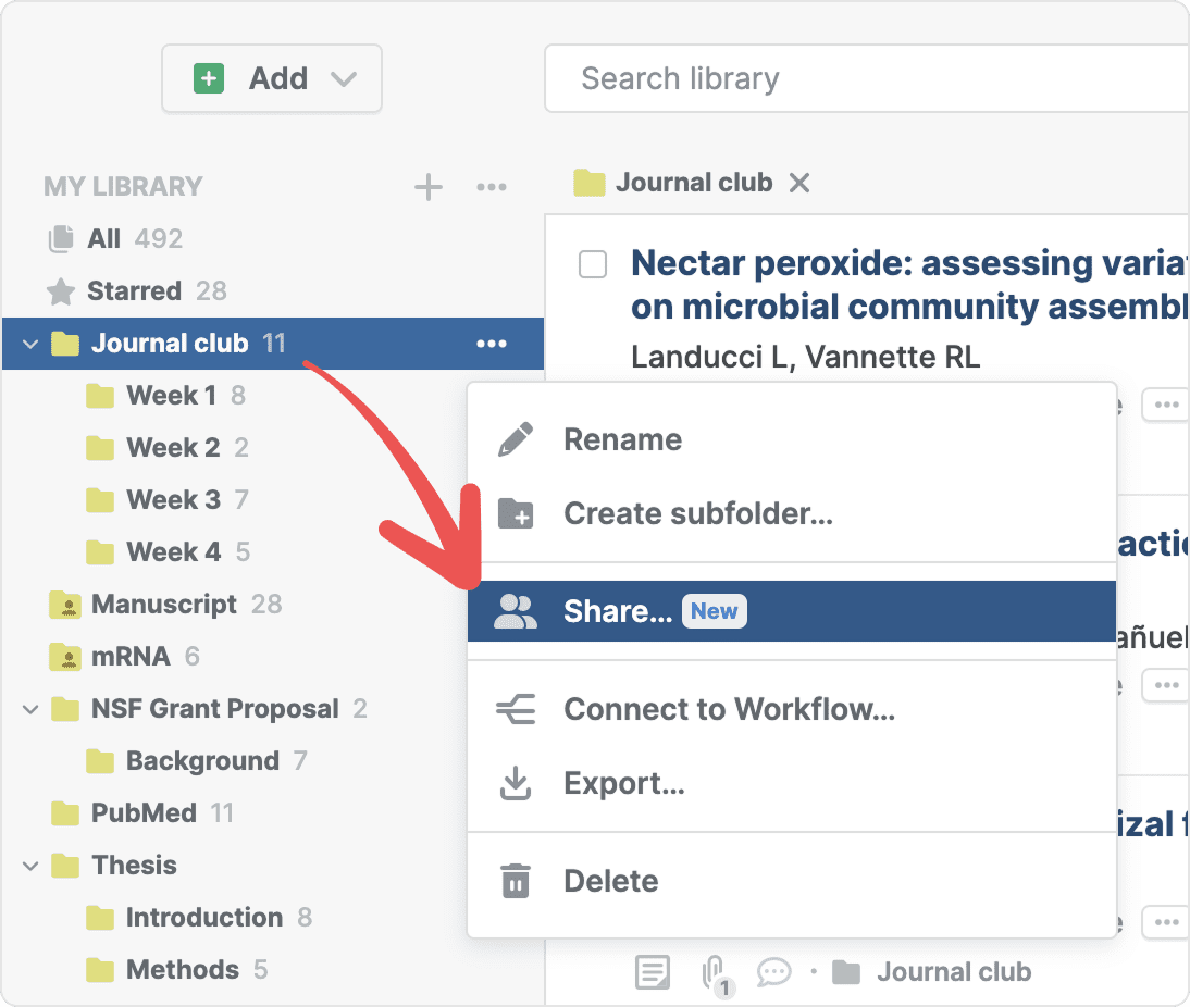 You can share any of your folders with other Paperpile users. You control whether others can only view the folder, or also add or change references, and whether they can see your annotations or notes.