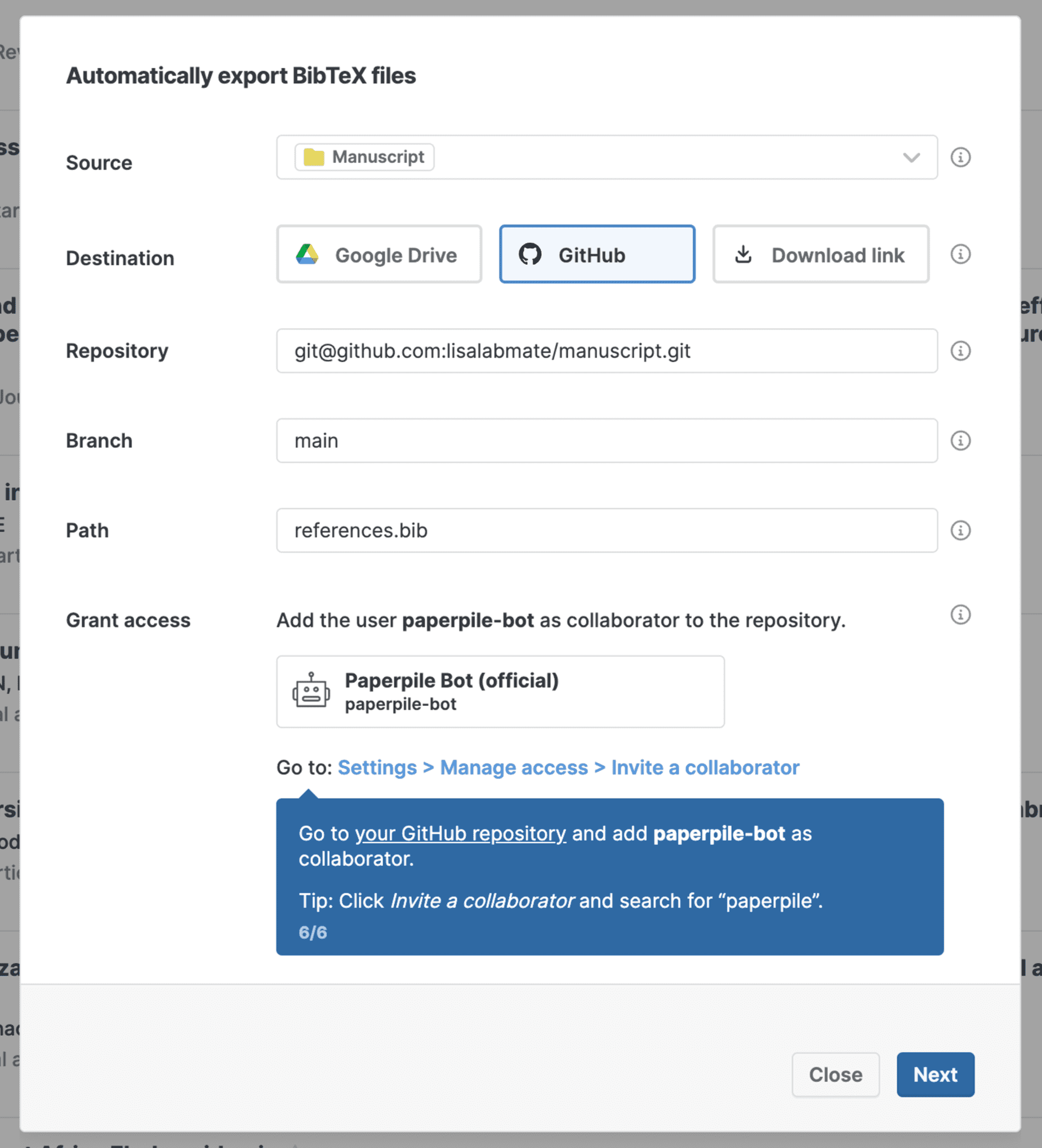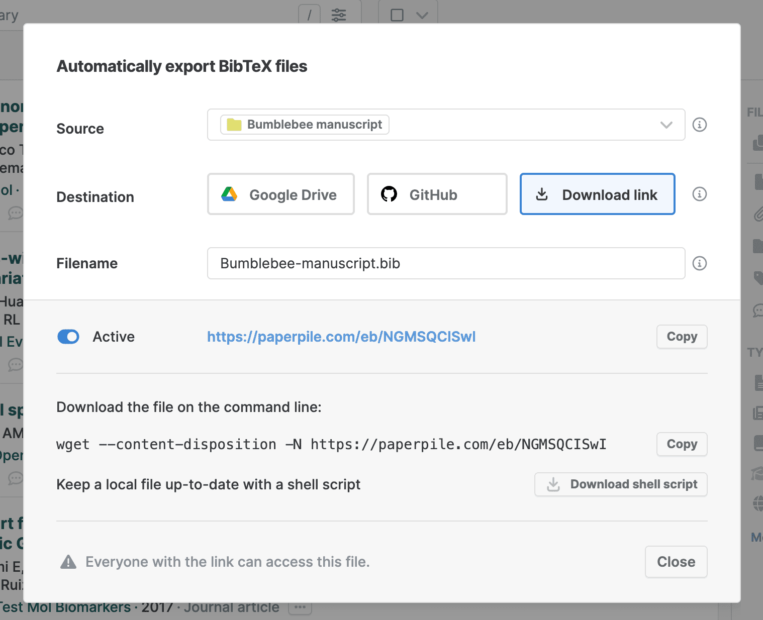 You can automatically sync a folder, label, or your complete Paperpile library to a BibTeX file in Google Drive, GitHub, or a downloadable web link.