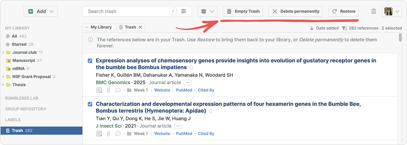 When you no longer need a reference in your library, you can move it to the Trash. References in the Trash can be restored at any time or permanently deleted to free up space in your library.