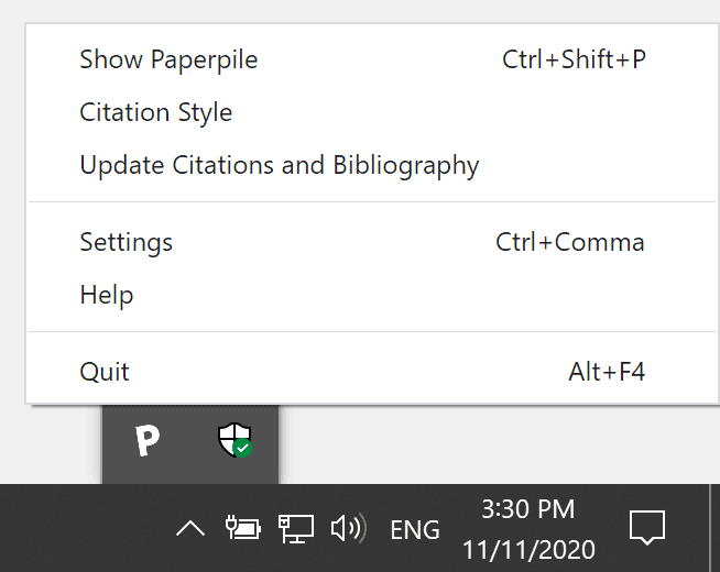 - (Windows) Make sure both Paperpile and Word are running with the same privileges (either normal or as admin). Completely close Word (with the Close button ( X )) and Paperpile (in the taskbar, right-click on the P icon and select Quit) and run them again either normally (double-clicking on the apps) or as admin (right click the apps and select Run as administrator).