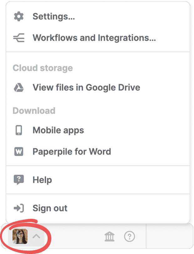 Click your profile picture in the bottom left of the sidebar to access Settings, Workflows and Integrations, cloud storage options, download options, the help menu, and sign out.