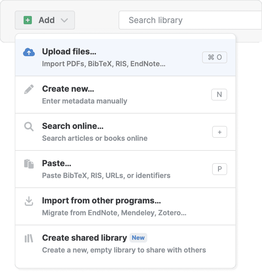 - Label menu: Add labels to references or remove labels from selected references. You can add references to multiple labels at once and create new labels directly from this menu. See Organize your library with labels for more details.